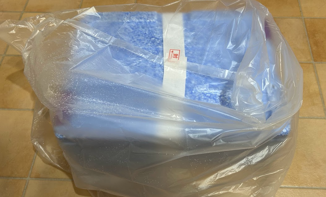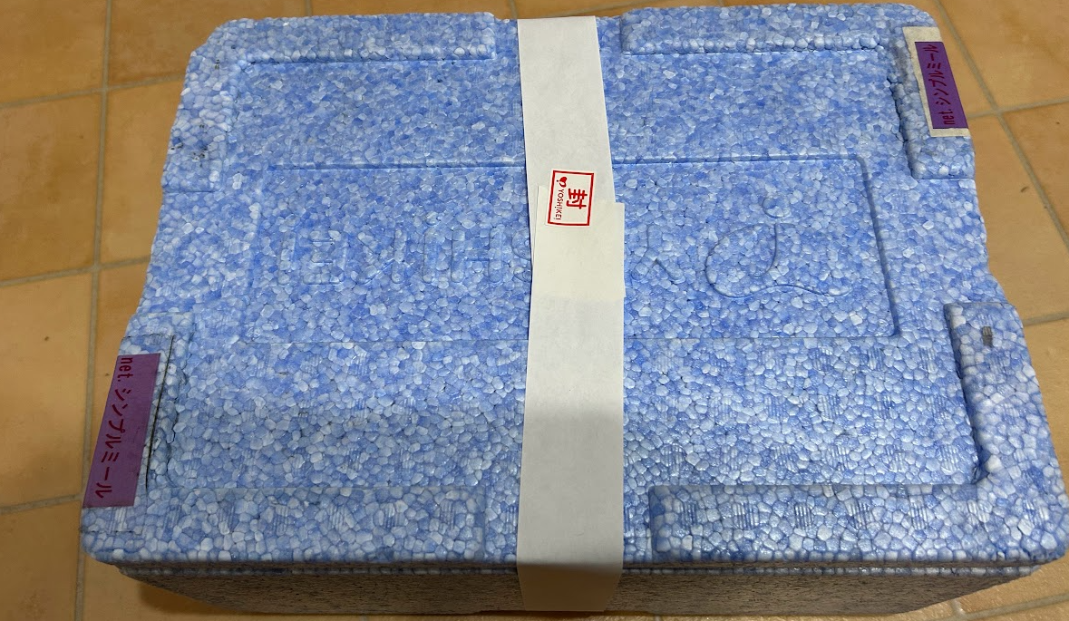 ちょうど出かけていて、玄関前に届けてくれていたのが何時間前なのかはわかりませんが、断熱材と保冷剤入りでしっかり冷凍のままでした。